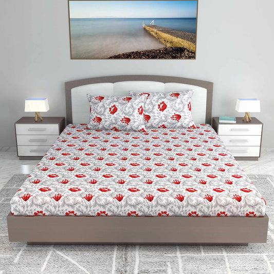 Tulip Floral 100% Cotton Bedsheet for King Size Bed - Grey and Red