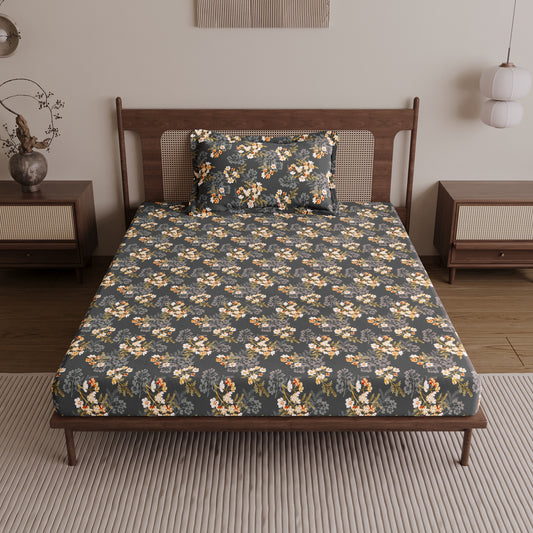 Graphite Shade Floral 144 TC Cotton Single Bedsheet With 1 Pillowcover
