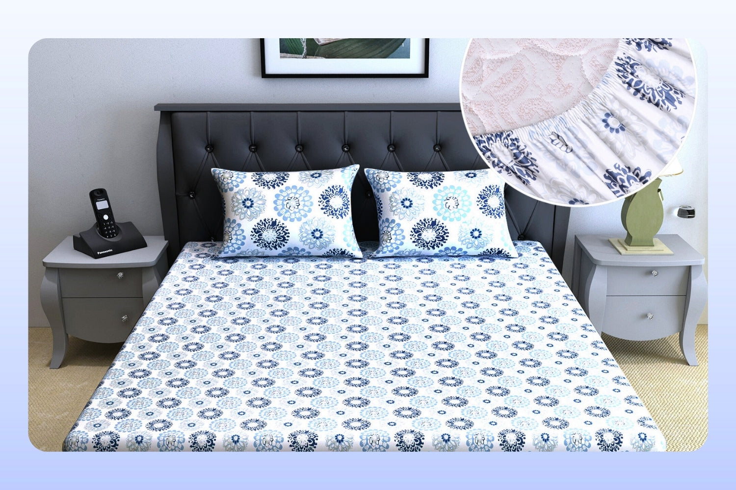 Blue and Grey Floral Print Elastic Fitted Combo Bedsheet For Single Bed