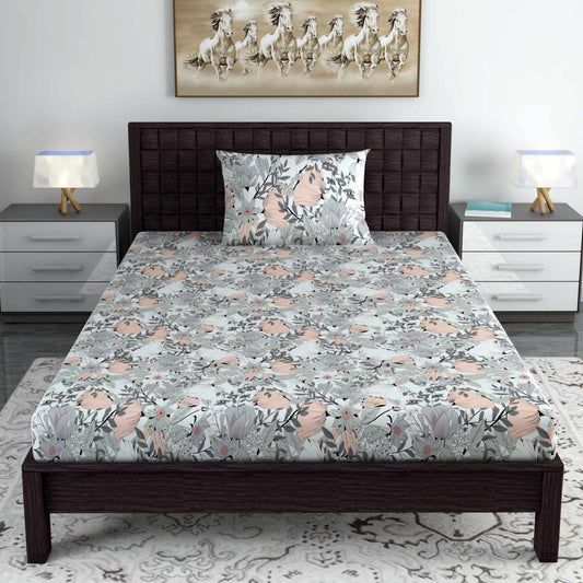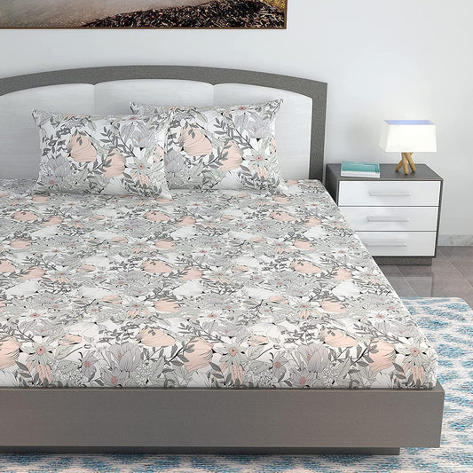 210 TC Elegant Floral Grey King Size Bedsheet with 2 Pillow Covers