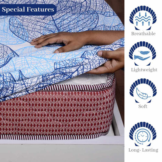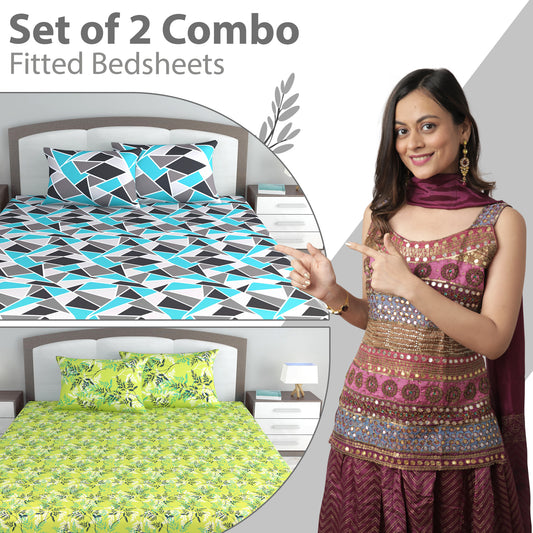 Blue Abstract and Green Leaf Set of 2 Elastic Fitted Combo Bedsheet For King Size Bed