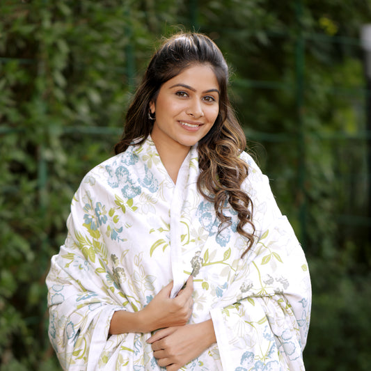 Blue, Green and White Floral Pattern Cotton Dohar Combo For Double Bed