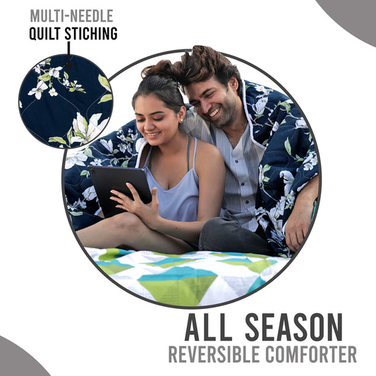 Blue Abstract and Green Floral Microfiber Comforter Combo For Single Bed