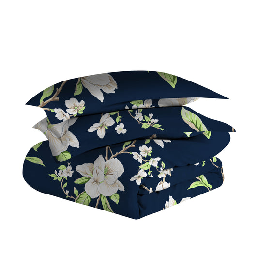 Microfiber Reversible Double Bed Queen Size Floral Printed Duvet Cover, Green & Navy Blue