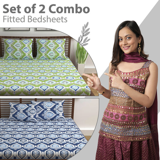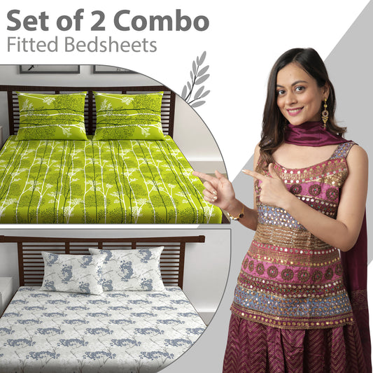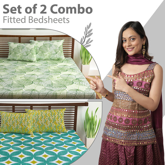 Green and Abstract Print Elastic Fitted Combo Bedsheet For Double Bed