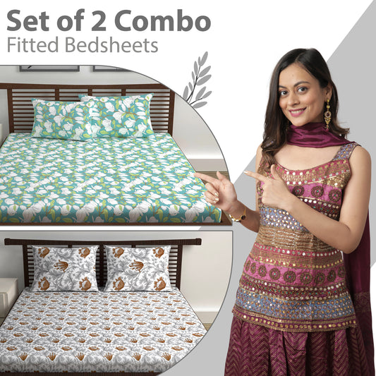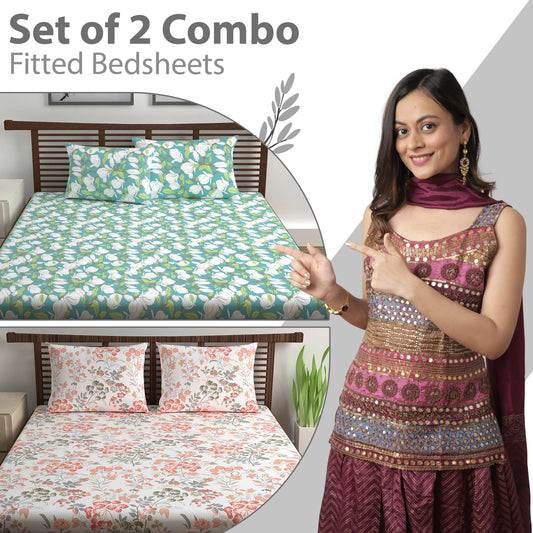 Green and Peach Floral Print Elastic Fitted Combo Bedsheet For Double Bed