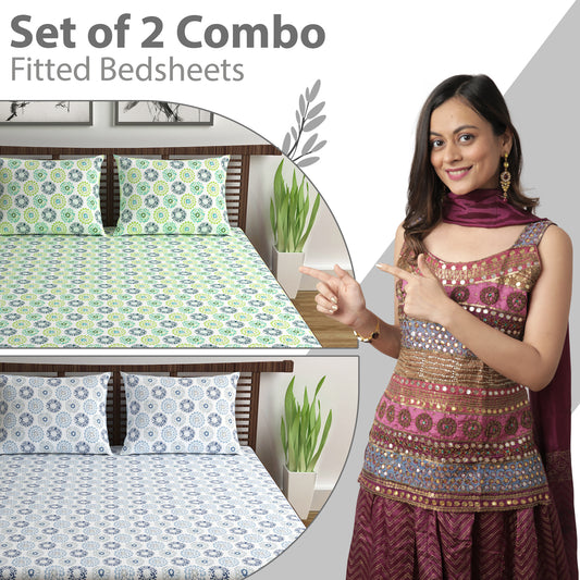 Green and Blue Dahlia Print Elastic Fitted Combo Bedsheet For Double Bed