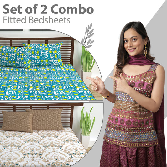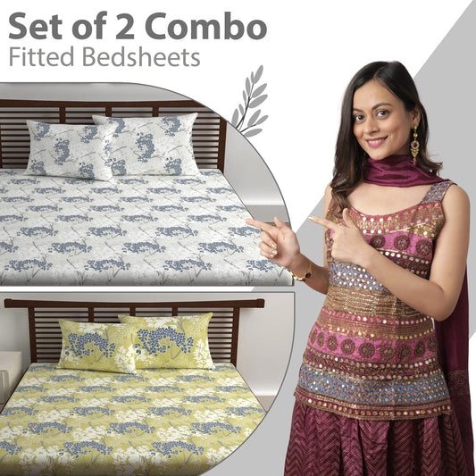 Ethnic Floral And Leaf Pattern Elastic Fitted Double Bedsheet Combo