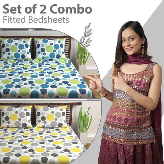 Blue and Yellow Polka Dots Elastic Fitted Combo Bedsheet For Double Bed