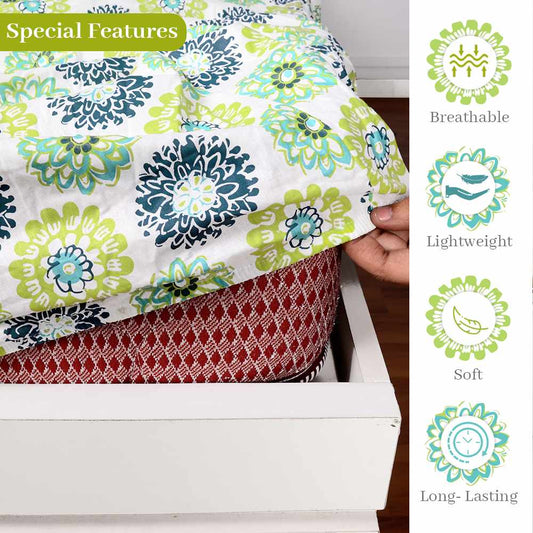 Green Dahlia Floral Printed Elastic Fitted Double Bed Bedsheet