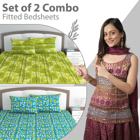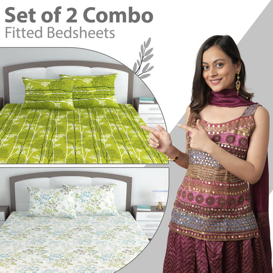 Green Leaf Pattern Elastic Fitted Combo Bedsheet For King Size Bed Set of 2