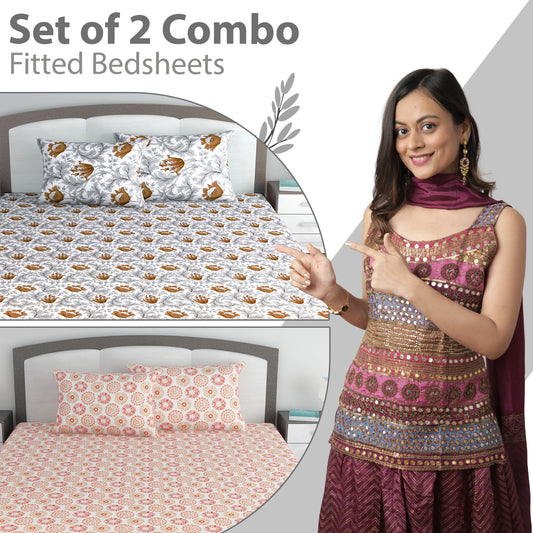 Brown and Peach Color Elastic Fitted Combo Bedsheet For King Size Bed Set of 2