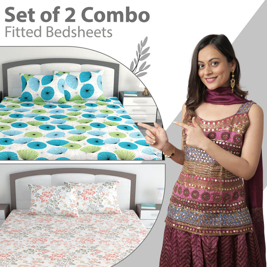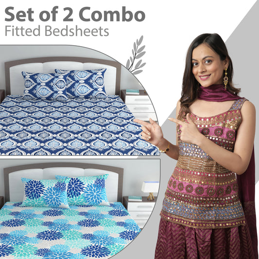 Blue Dahlia and Green Floral Set of 2 Elastic Fitted Combo Bedsheet For King Size Bed