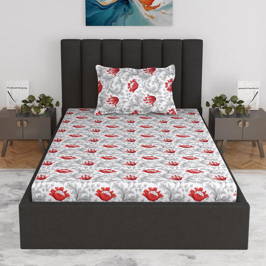 Tulip Floral Elastic Fitted Bedsheet for Single Bed - Grey and Red