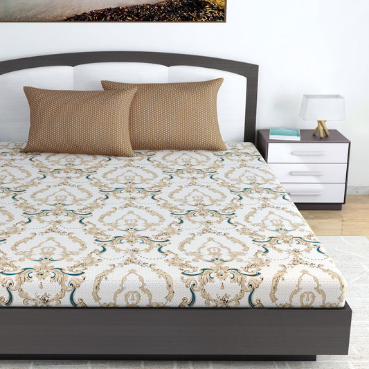 Ivory Gold Floral Bedsheet For King Size Bed with 2 Pillow Covers