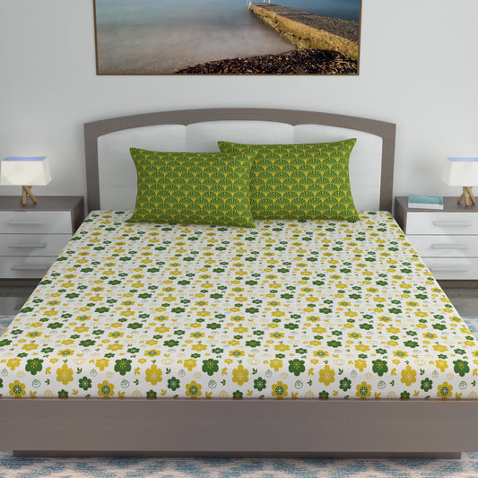 Mustard Green Floral 144 TC Polycotton King Bedsheet With 2 Pillowcovers