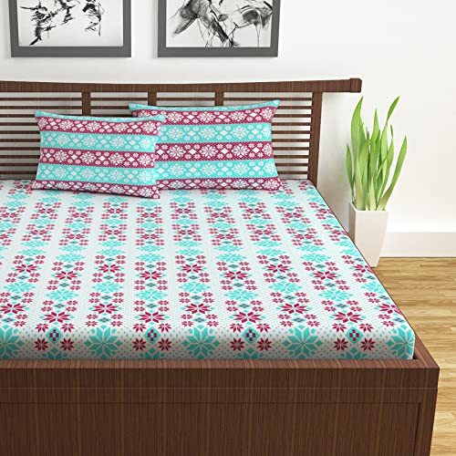 Aqua Scarlet Floral 144 TC Polycotton Double Bedsheet With 2 Pillowcovers