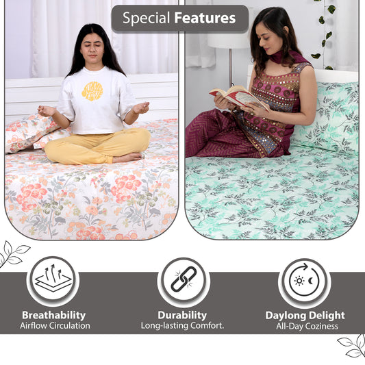 Peach and Green Floral Print Combo Bedsheet for Single Bed