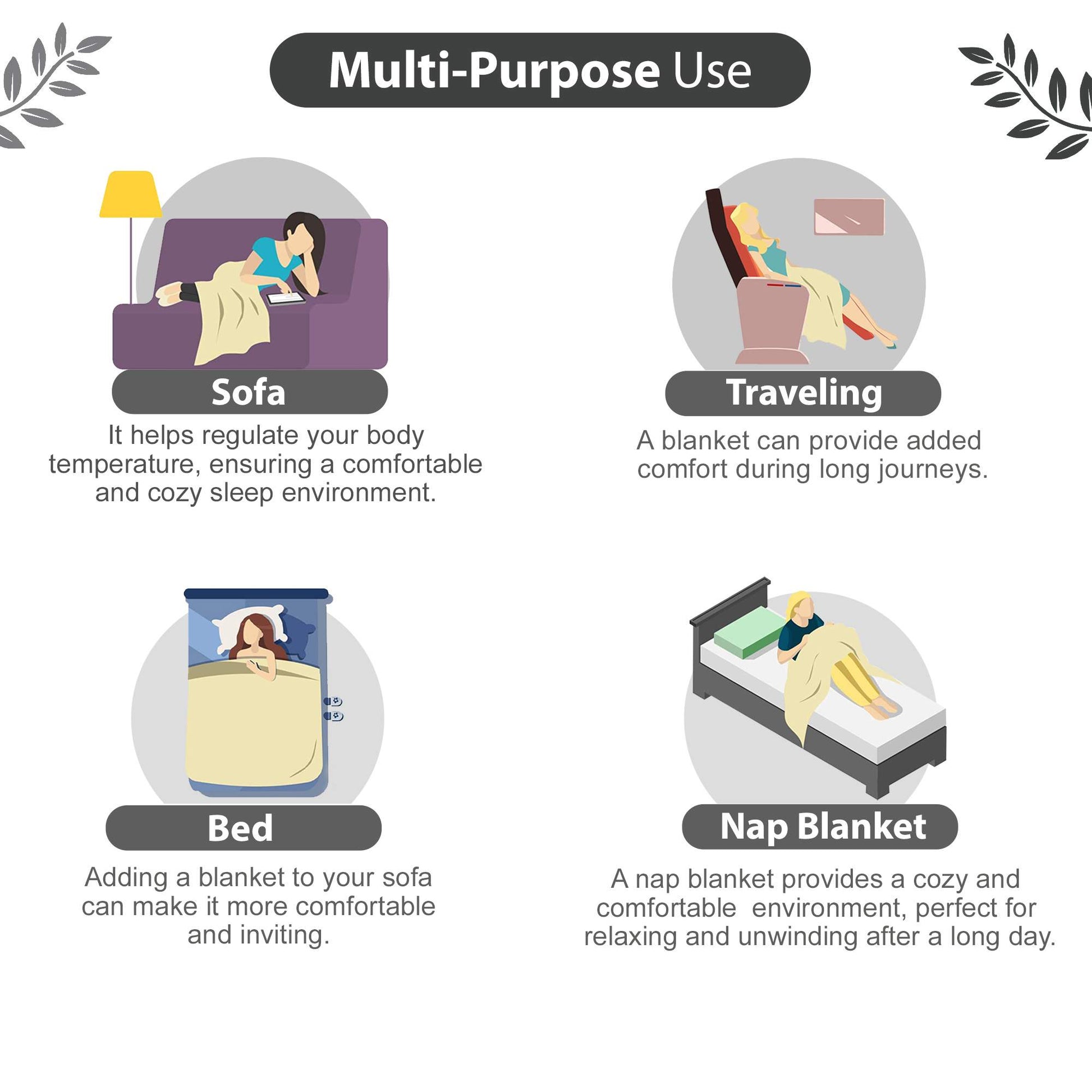 Usage: Bedding Layer, Summer Blanket, Couch Throw, Travel Companion, Picnic Blanket, Nursing Cover, Baby Blanket, Home Décor, Gift Wrap, Beach Mat, Camping Companion, Yoga or Meditation Mat, Pet Bedding, Emergency Blanket