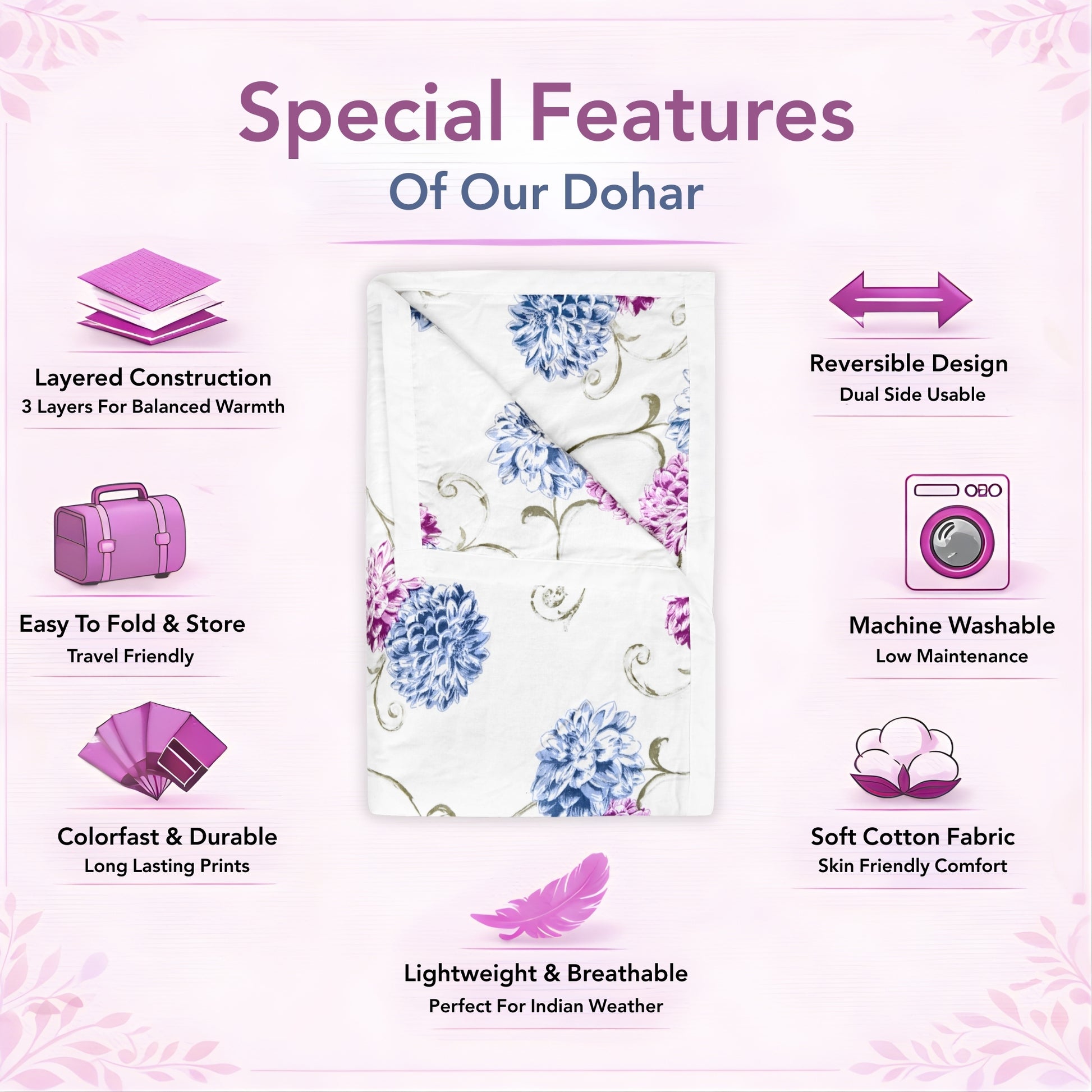Blue Pink Floral Pure Cotton Lightweight Dohar For Single Bed