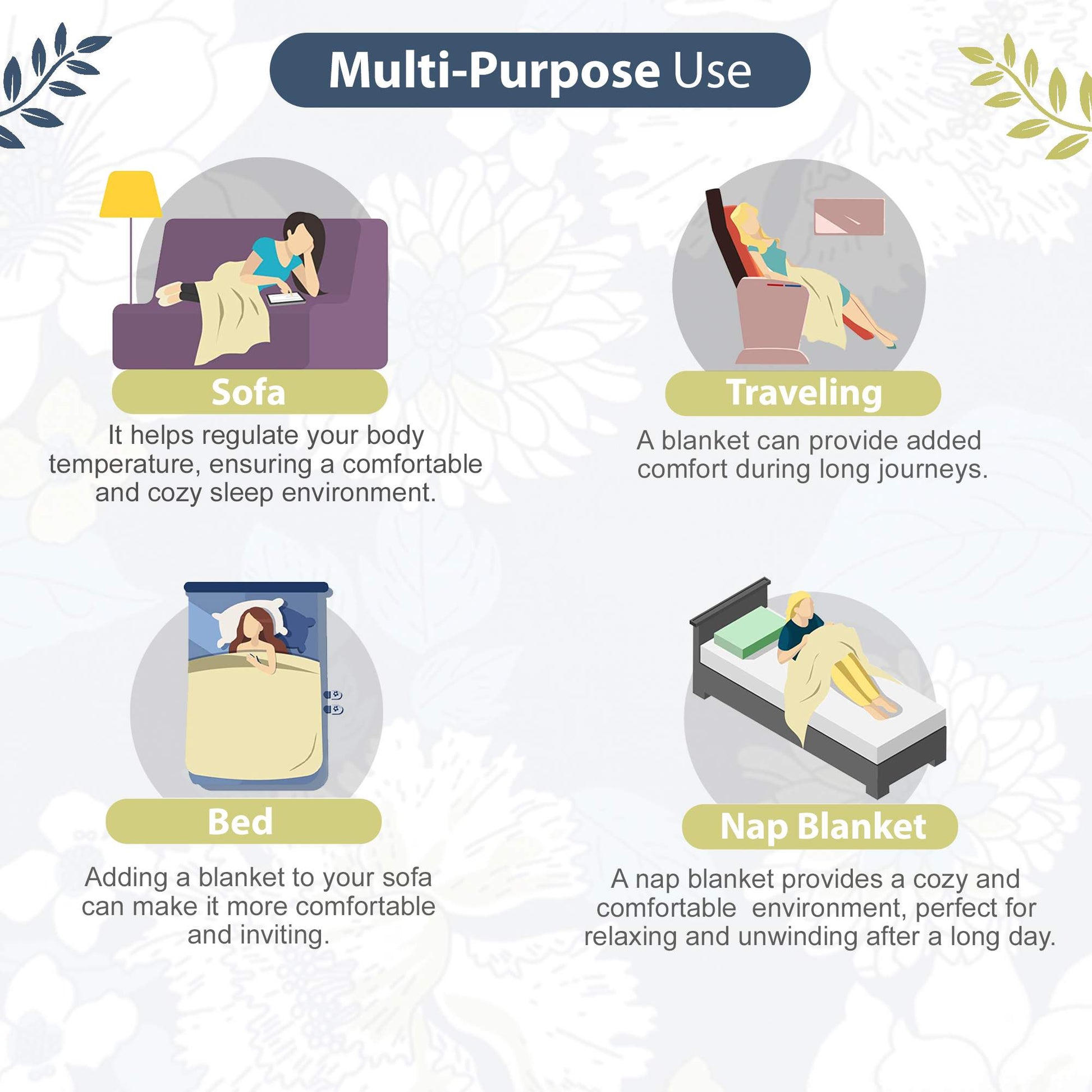 • Usage: Bedding Layer, Summer Blanket, Couch Throw, Travel Companion, Picnic Blanket, Nursing Cover, Baby Blanket, Home Décor, Gift Wrap, Beach Mat, Camping Companion, Yoga or Meditation Mat, Pet Bedding, Emergency Blanket