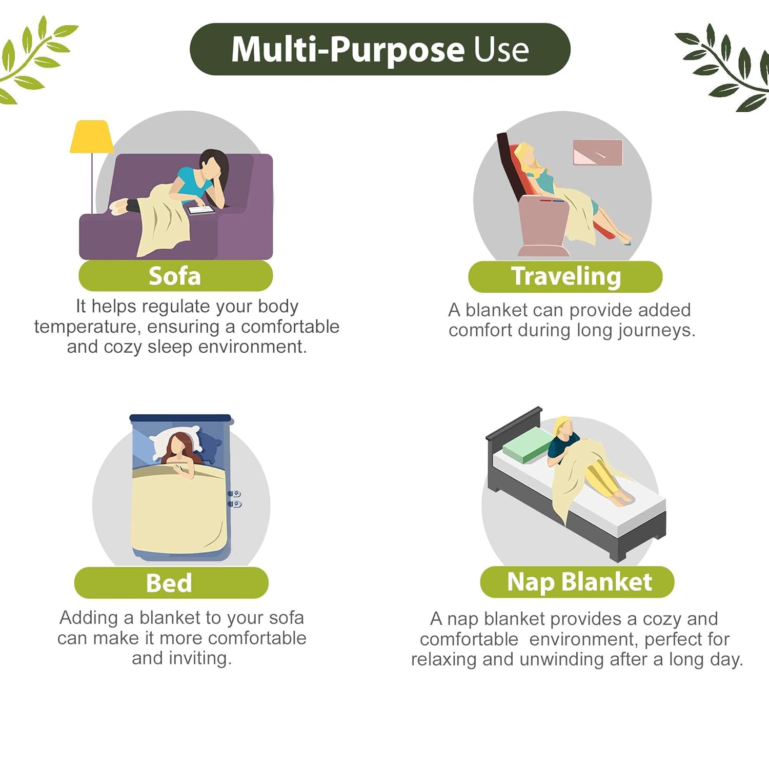 Usage: Bedding Layer, Summer Blanket, Couch Throw, Travel Companion, Picnic Blanket, Nursing Cover, Baby Blanket, Home Décor, Gift Wrap, Beach Mat, Camping Companion, Yoga or Meditation Mat, Pet Bedding, Emergency Blanket