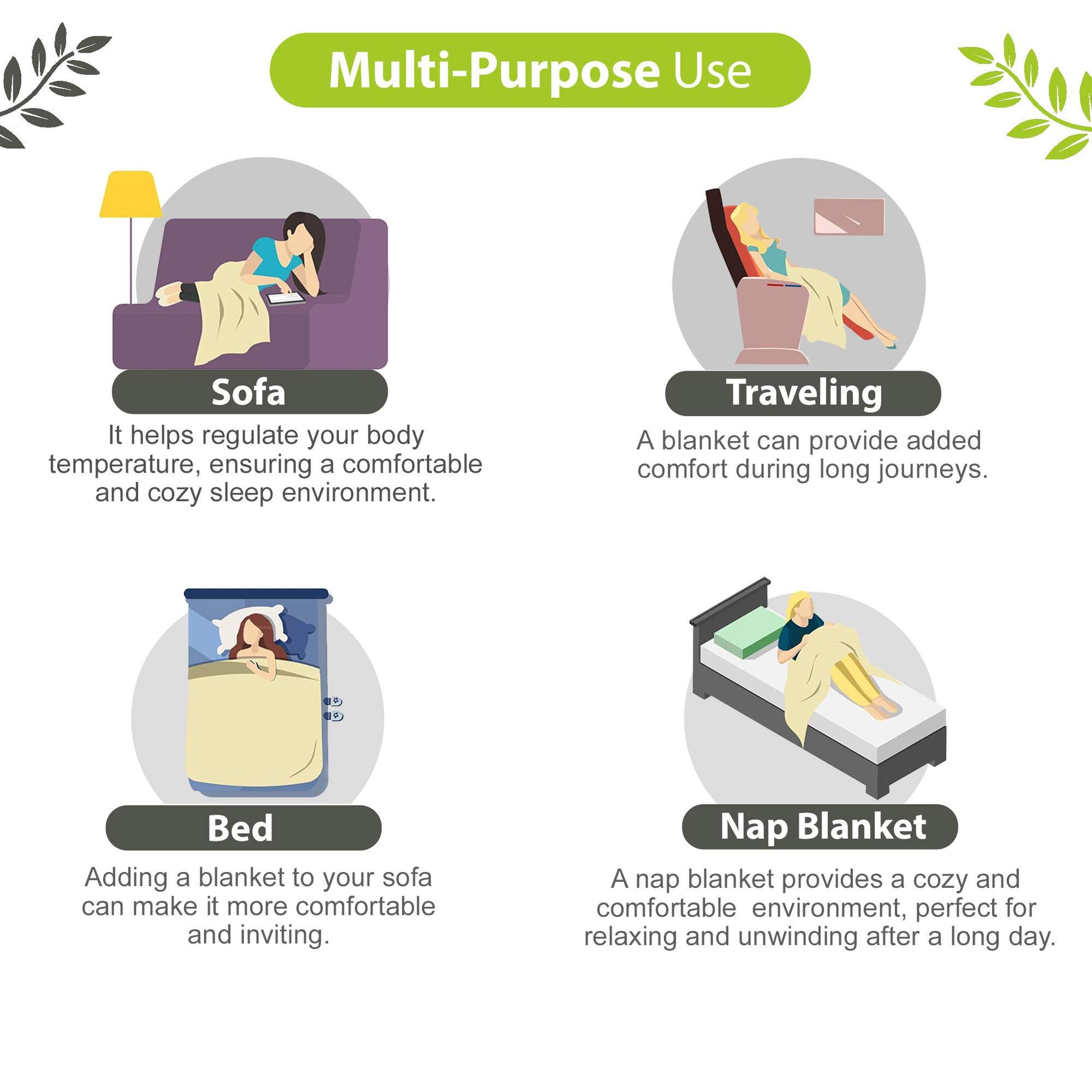 • Usage: Bedding Layer, Summer Blanket, Couch Throw, Travel Companion, Picnic Blanket, Nursing Cover, Baby Blanket, Home Décor, Gift Wrap, Beach Mat, Camping Companion, Yoga or Meditation Mat, Pet Bedding, Emergency Blanket