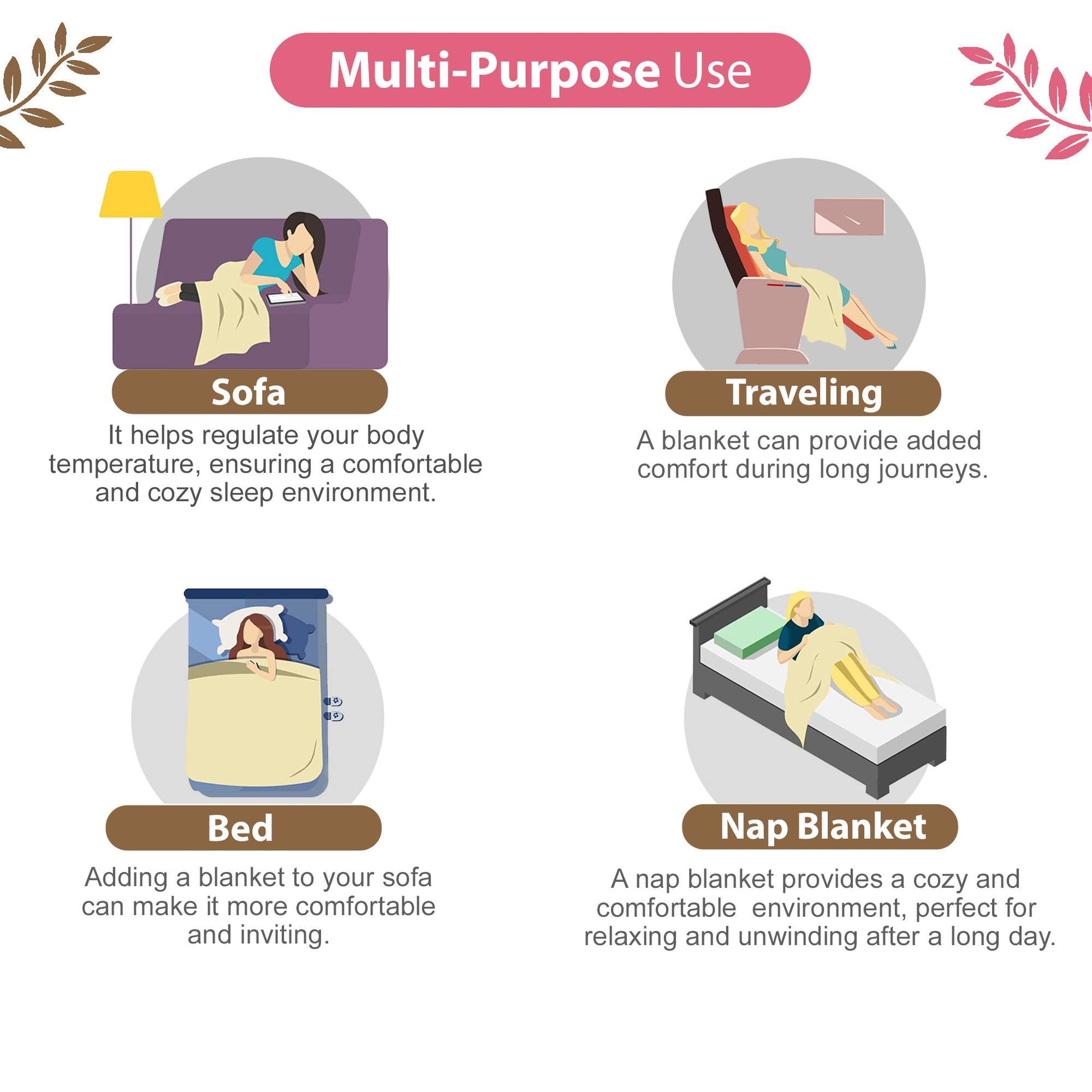 • Usage: Bedding Layer, Summer Blanket, Couch Throw, Travel Companion, Picnic Blanket, Nursing Cover, Baby Blanket, Home Décor, Gift Wrap, Beach Mat, Camping Companion, Yoga or Meditation Mat, Pet Bedding, Emergency Blanket
