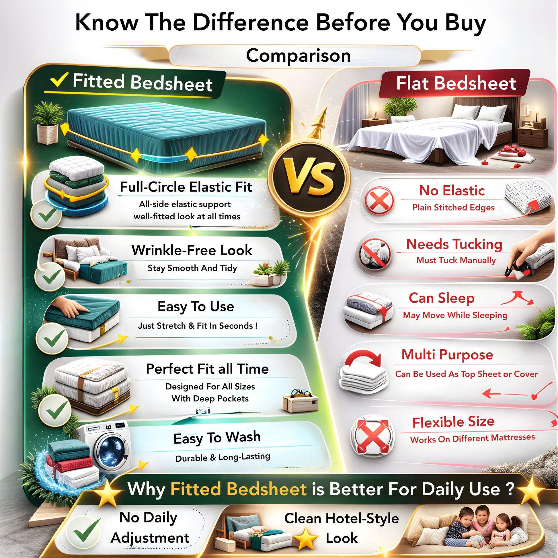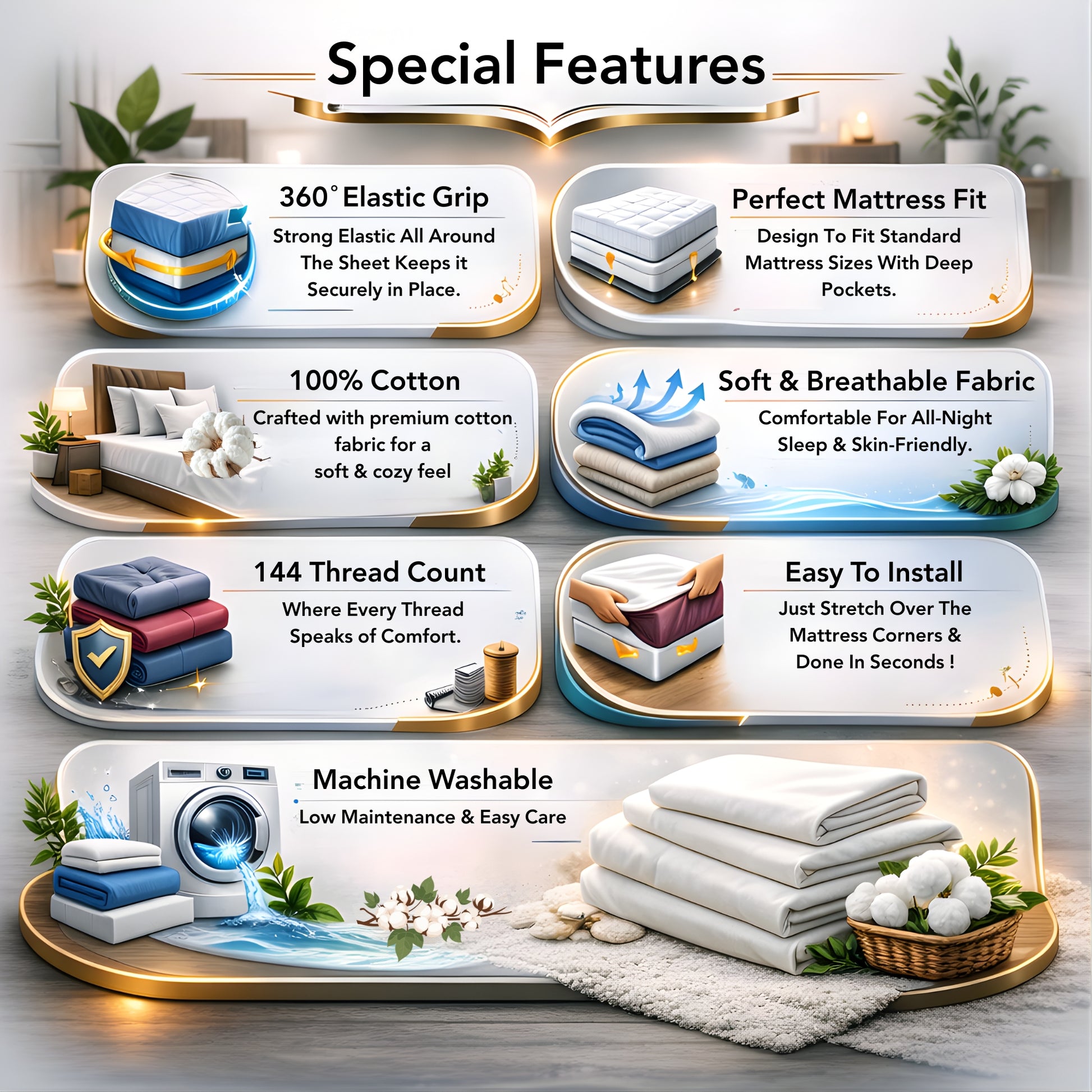 Discover the ultimate in comfort and convenience with our 100% Cotton 144 TC Elastic Fitted Bedsheet. Crafted with meticulous attention to detail, this bedsheet combines premium quality cotton with innovative design features to provide you with an unparalleled sleeping experience.