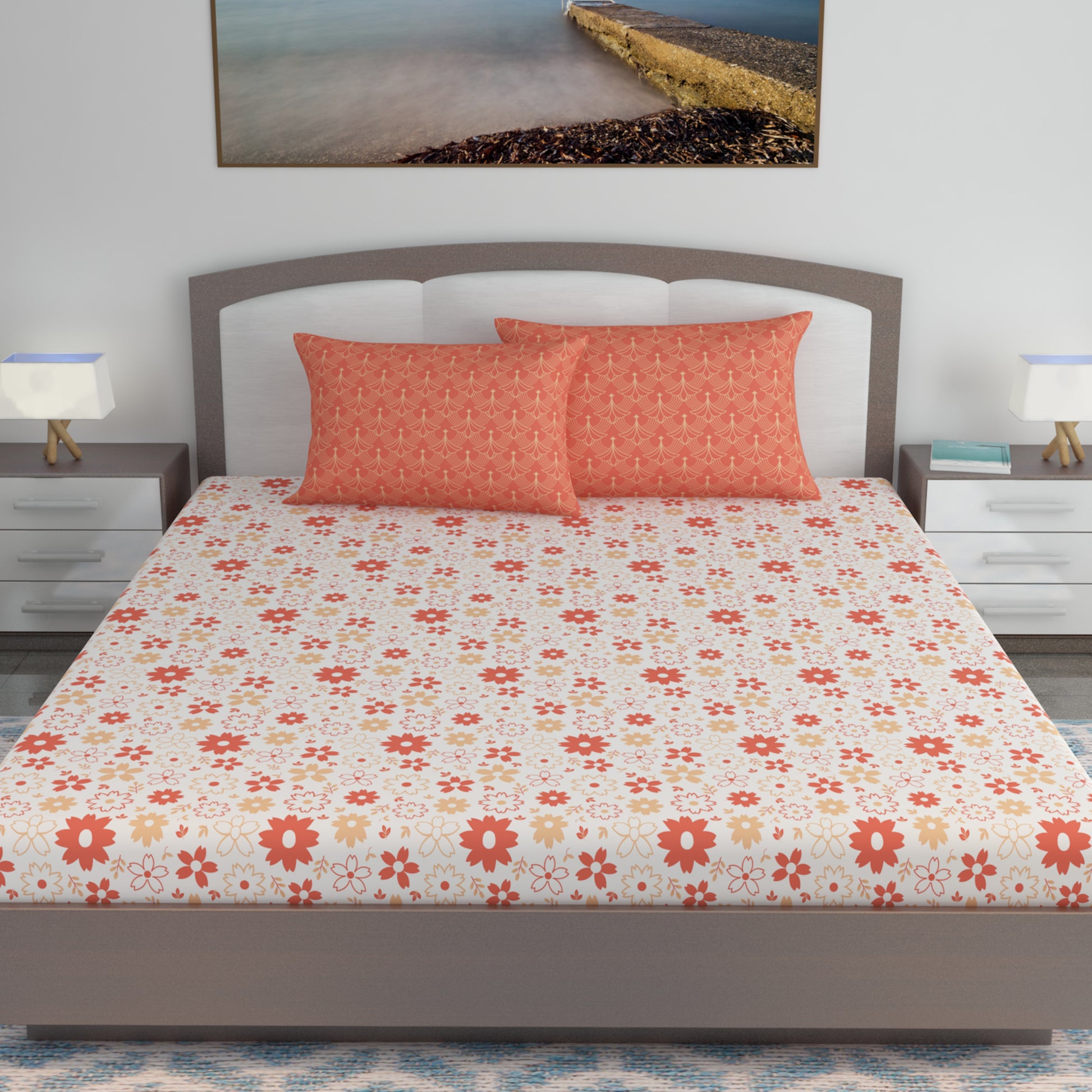 Rust White Floral 144 TC Polycotton King Bedsheet With 2 Pillowcovers
