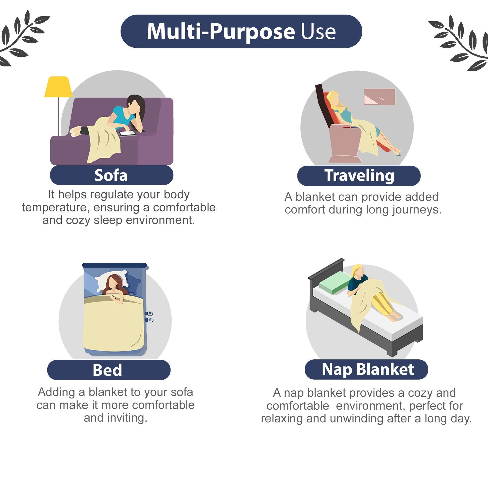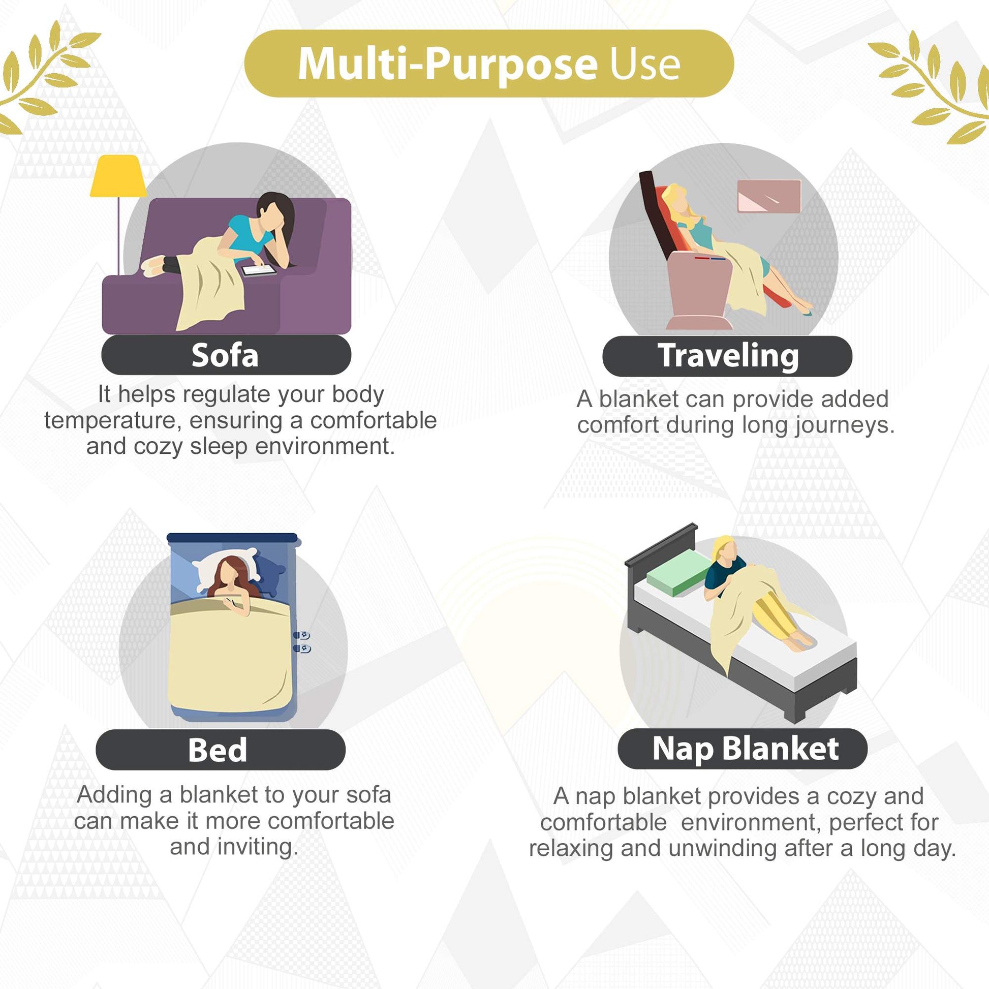 • Usage: Bedding Layer, Summer Blanket, Couch Throw, Travel Companion, Picnic Blanket, Nursing Cover, Baby Blanket, Home Décor, Gift Wrap, Beach Mat, Camping Companion, Yoga or Meditation Mat, Pet Bedding, Emergency Blanket